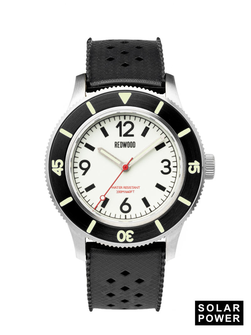 A huge safety improvement compared to period watches, Redwood uses non-radioactive Swiss Super-LumiNova luminescent pigments. The pigment appears off-white in daytime conditions and produces a strong greenish glow in low light after exposure to light or UV. The bezel, all three hands and the dial are coated. White dial automatics feature a fully luminescent dial whereas other models have luminescent numerals and/or hour markers.