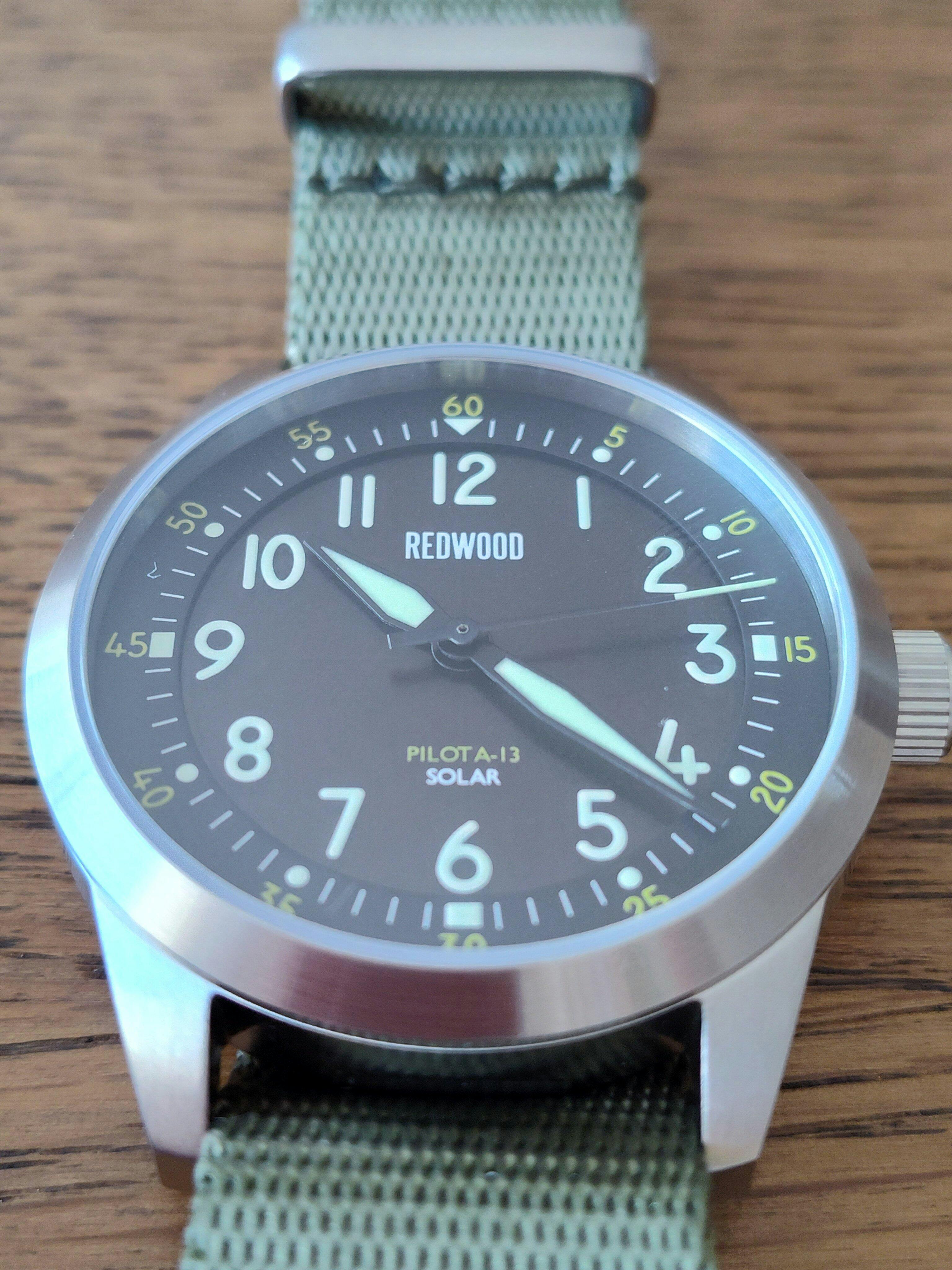 Some versions of the A-13 clocks used radioactive tritium to provide illumination, causing safety issue. Redwood uses non-radioactive Super-LumiNova pigments, a major improvement over period tech. The pigment appears white in daytime conditions and produces a strong greenish glow in low light after exposure to light or UV. All three hands and 12 hour markers are coated for clear nighttime operation.