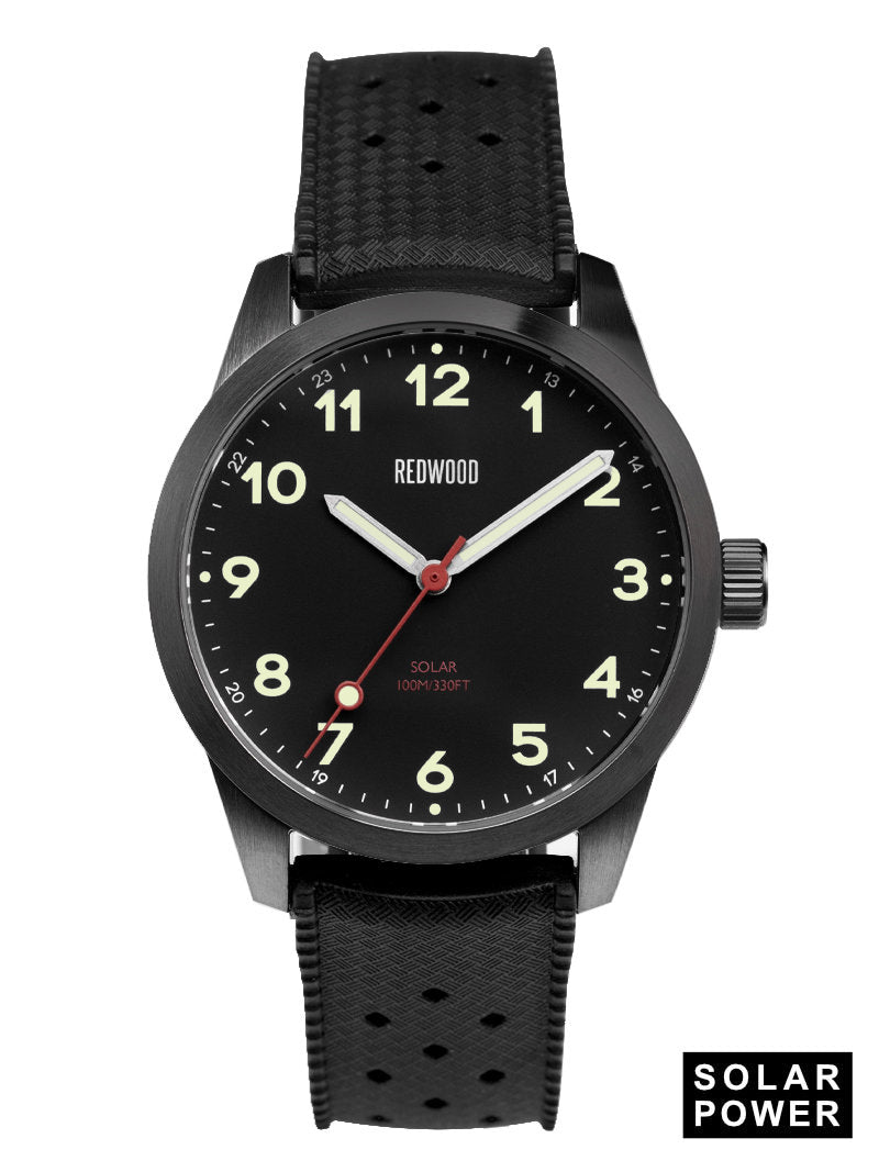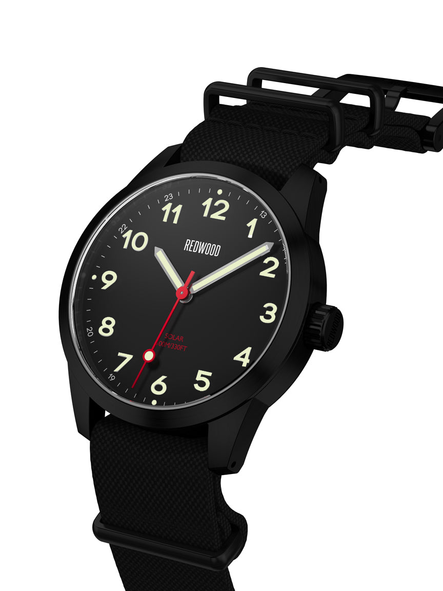 Our inspiration for the Redwood Monsoon were tough, understated watches with black dials, large illuminated numerals and hands and a waterproof case. Reinterpreted with modern movements and upgraded waterproofing, it is ready to report for duty. Even though most of us won’t infiltrate behind enemy lines, it is impressive to know the Monsoon has a strong historical background and the means to back its looks.