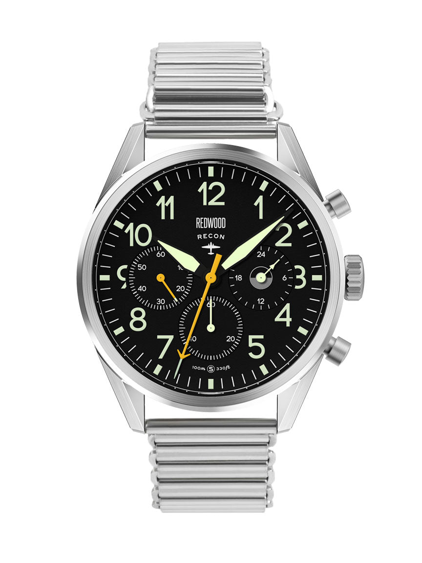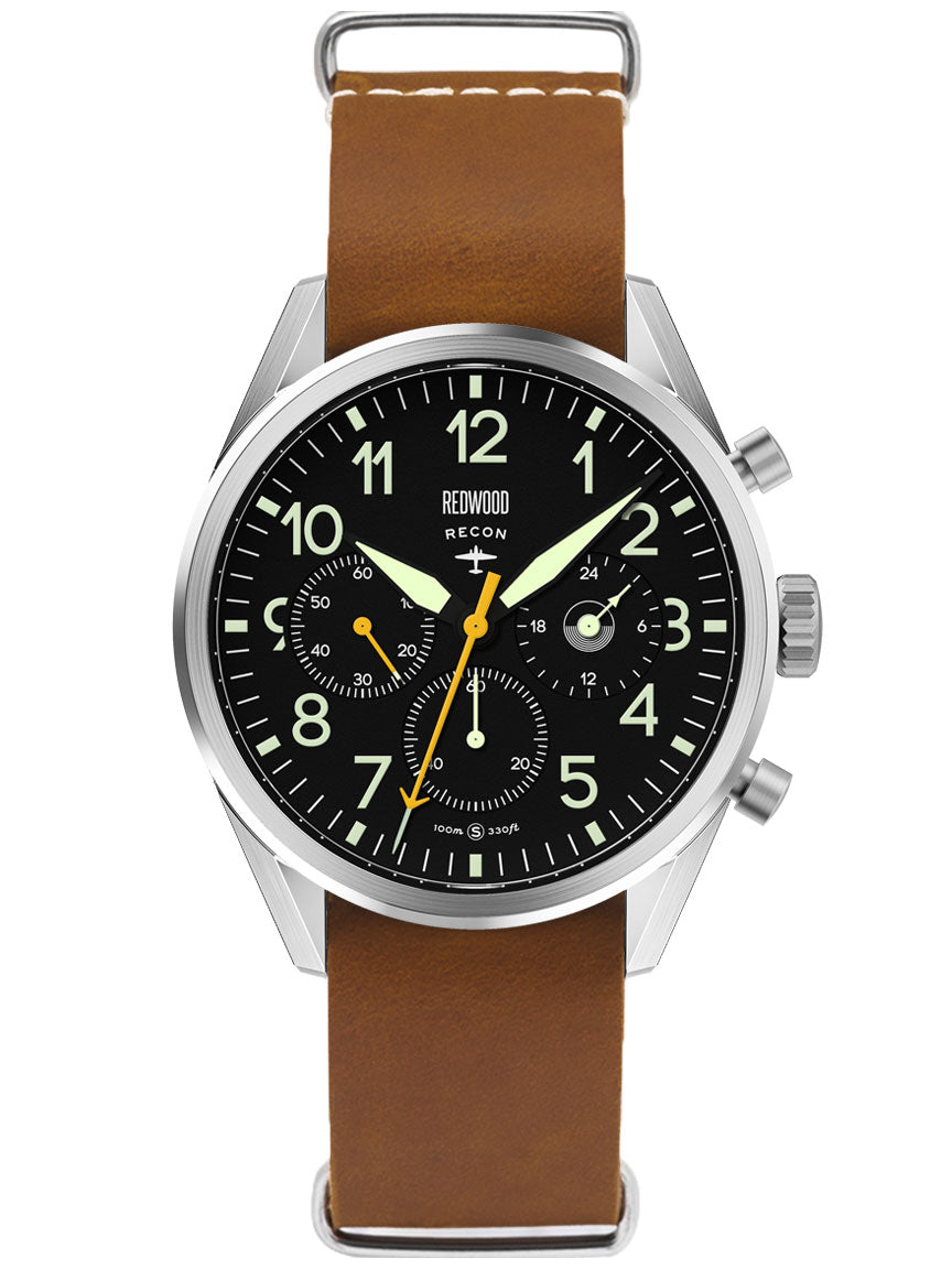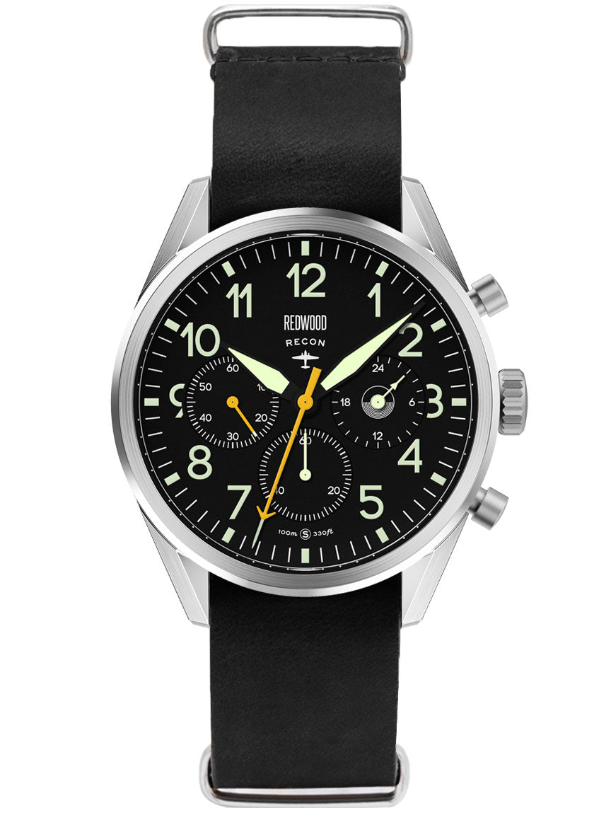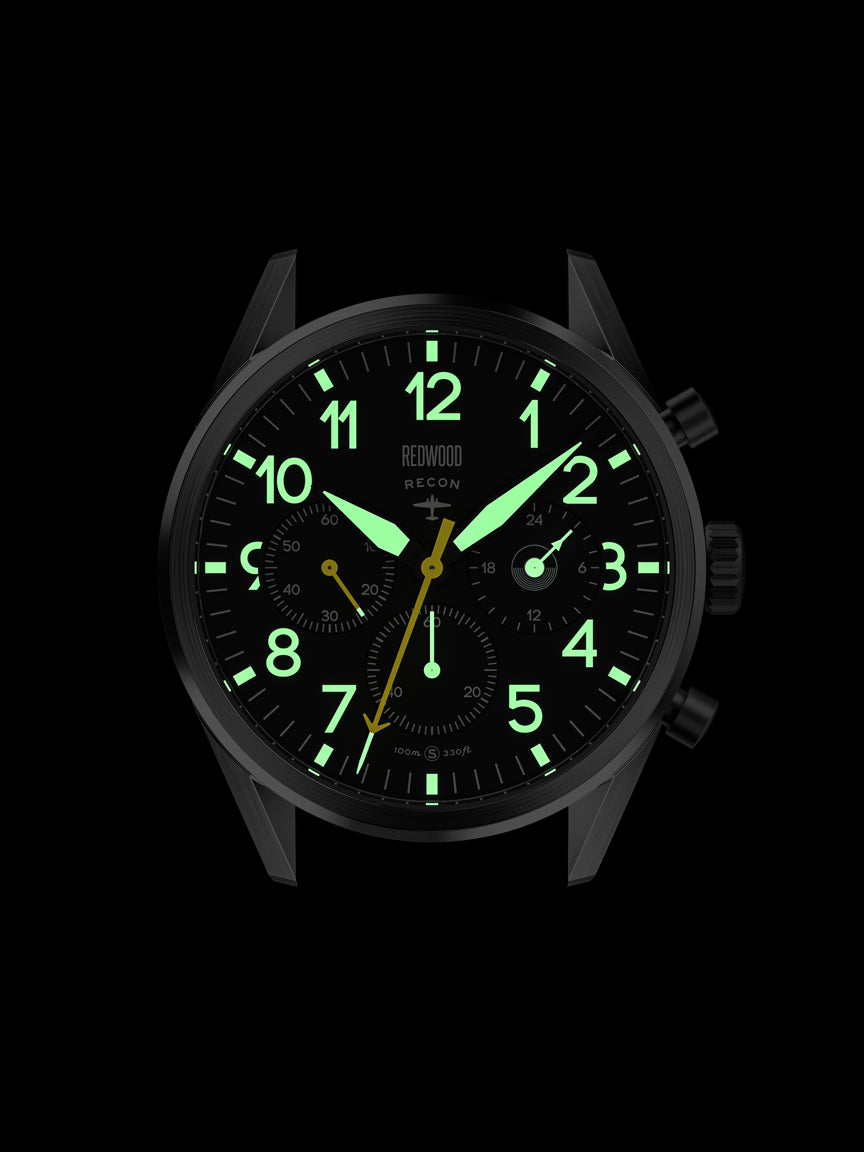 The Redwood Recon draws from that era, when timekeeping wasn’t aesthetic, it was operational. Inspired by the chronographs issued to Allied airmen from WWII onward, the Recon carries the clarity, legibility, and purpose of true pilot instruments.