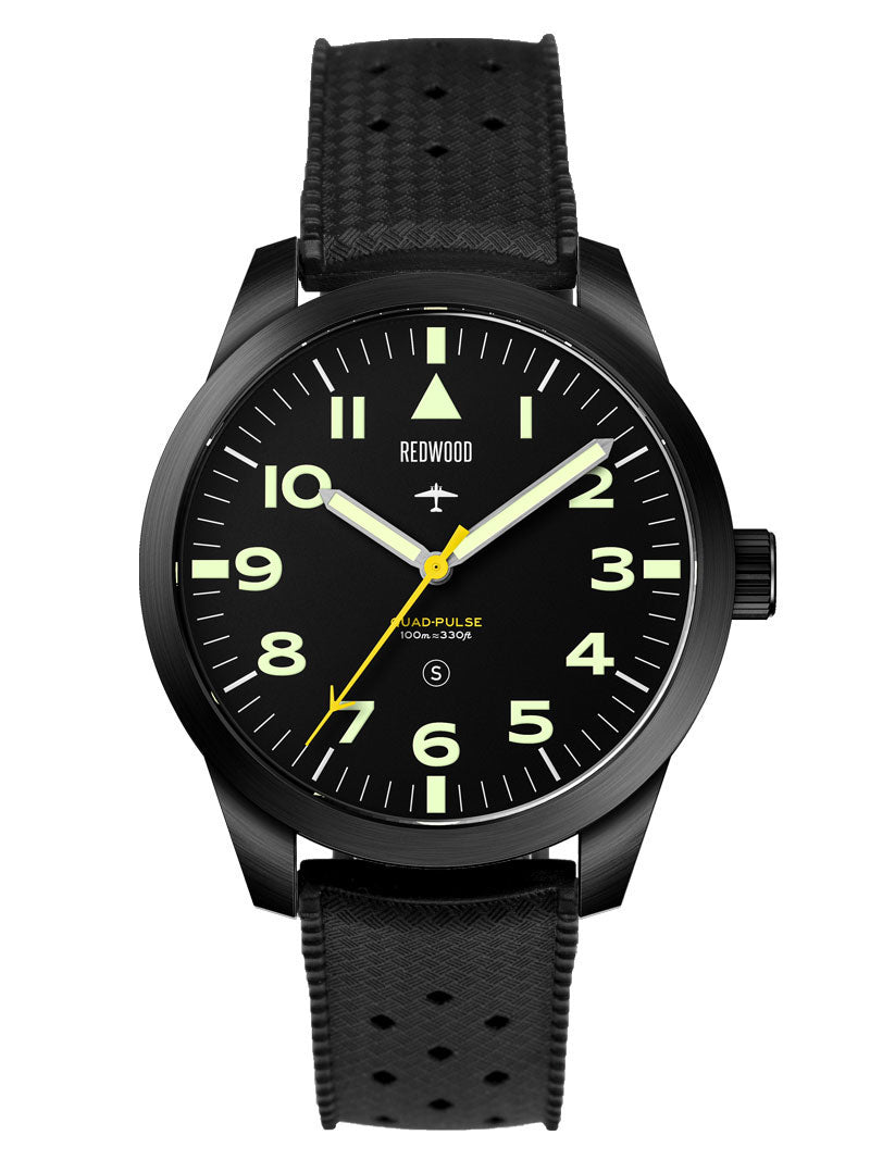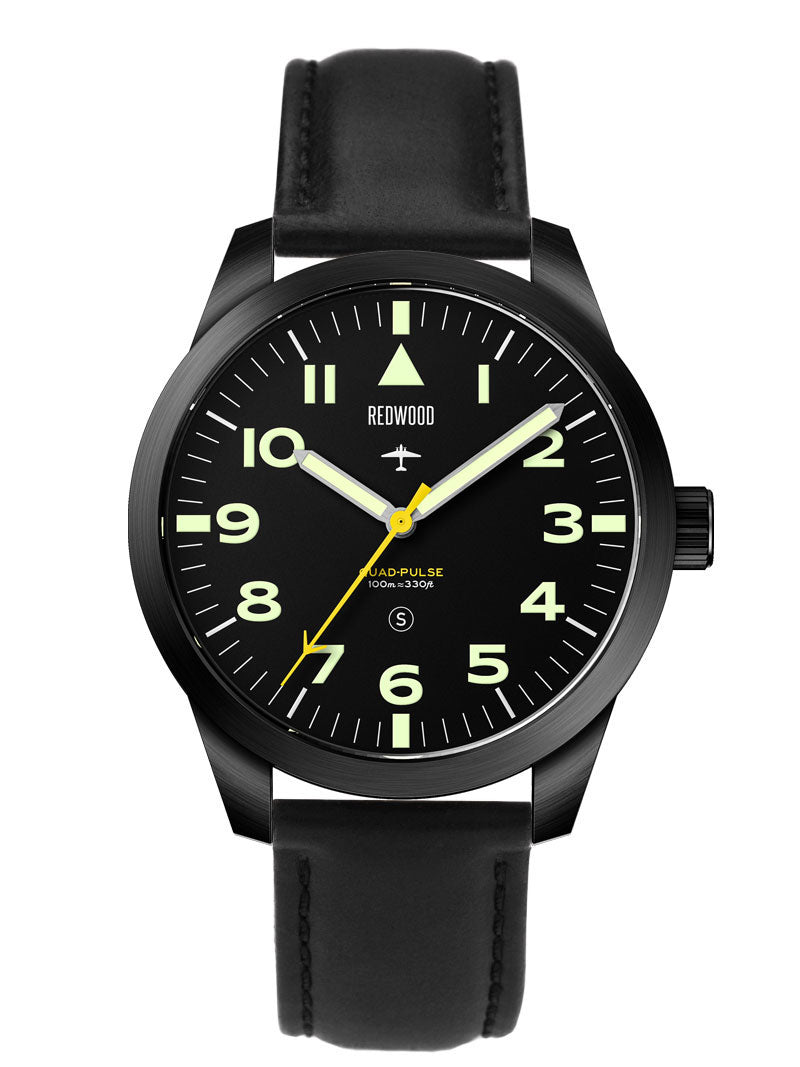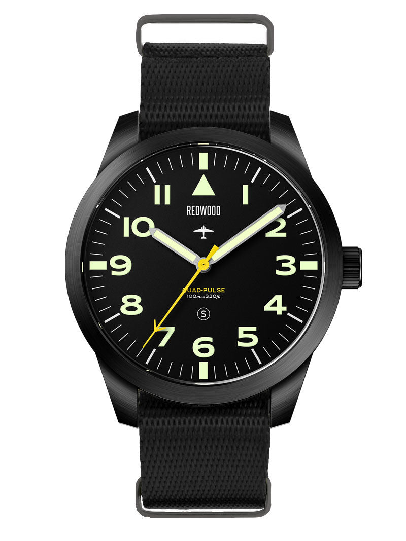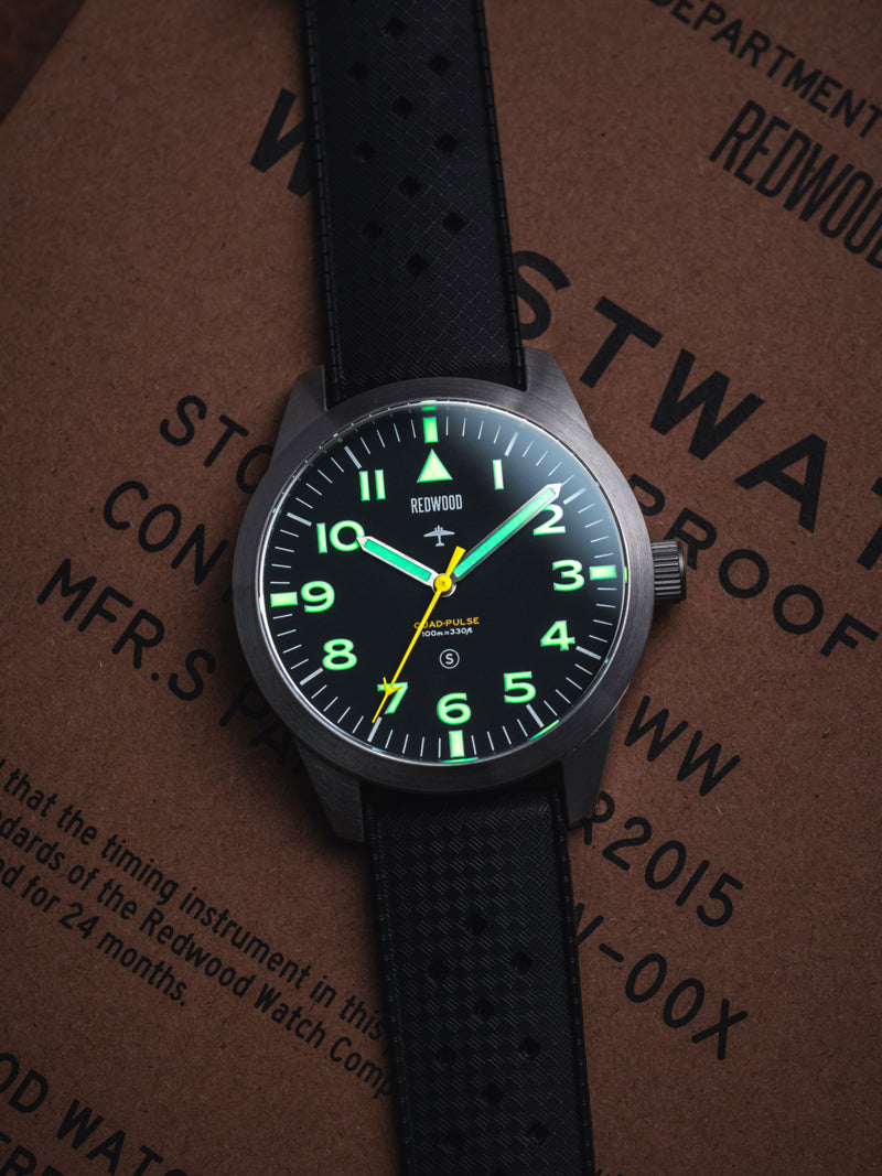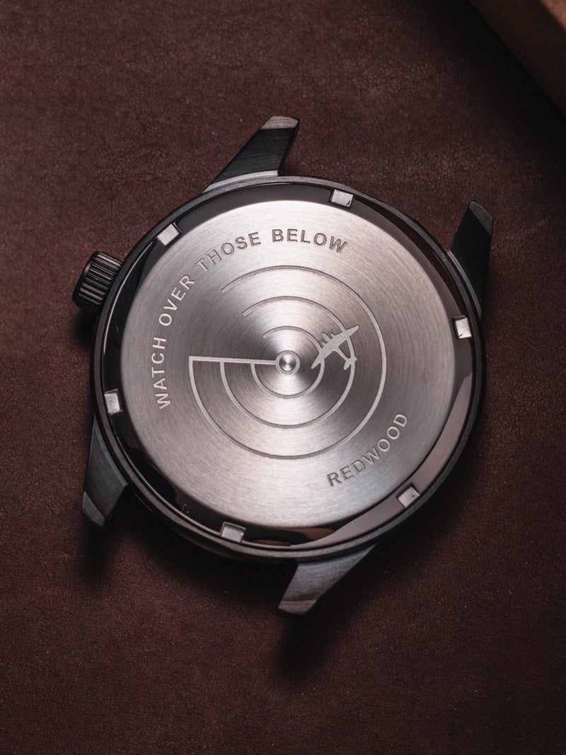 The Redwood Vulcan Stealth carries that spirit forward. Drawing from the legendary RAF design, it features the same clean symmetry, high-accuracy and no-nonsense utility. Re-engineered with a modern smooth-sweeping movement, it bridges past and present; a watch built not for display, but for duty. A descendant of history’s most capable pilot’s watch, ready for a new generation of explorers and aviators.
